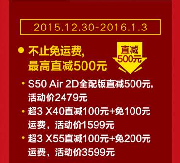 12月30日-2016年1月3日,S50 Air 2D全配版直减500元,活动价2479元;超3 X40直减100元+免100元运费,活动价1599元;超3 X55直减100元+免200元运费,活动价3599元。
