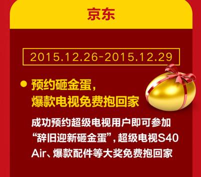 12月26日-12月29日,成功预约超级电视的用户即可参加“辞旧迎新砸金蛋”活动,超级电视S40、爆款配件等大奖免费抱回家。