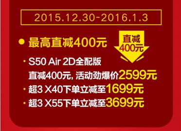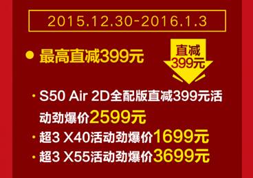 12月30日-2016年1月3日,S50 Air 2D全配版直减399元,仅售2599元;超3 X40 仅售1699元;超3 X55 仅售3699元。