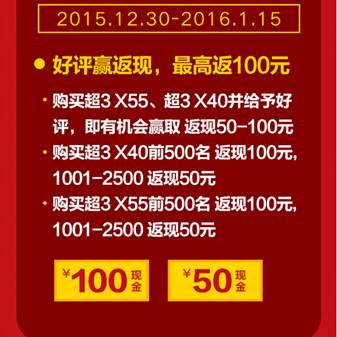 12月30日-2016年1月15日,购买超3 X55、超3 X40的用户,前2500名用户均可获得100元、50元不等的现金券。