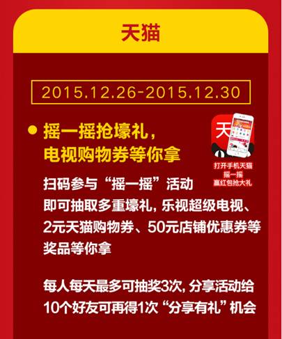 12月26日-12月30日,参与摇一摇活动即可抽取多重好礼,分享给好友还可增加3次摇奖机会。