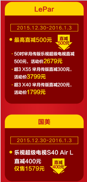 12月30日-2016年1月3日,LePar及国美线下店均有爆款型号立减活动,乐迷可根据需求前往购买。购买芈月版超级电视即可享受直减500元、300元及200元不等的优惠活动。国美各门店超级电视S40 AirL直减400元仅售1579元。