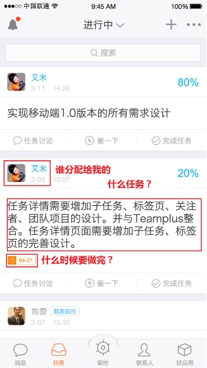 任务,就是每个人手头要做的事情。人们首先会关注任务的以下几个特性:这个任务是谁给分配的?任务的截止时间是什么时候? 这个任务要做什么事情?