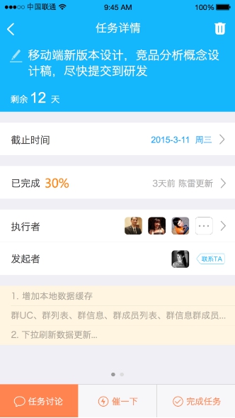 4. 底部的快捷工具栏,可以让用户快速的发起”任务讨论“。同时,当任务出现延期或者进度落后时,“催一下”的功能也可以充分让领导表达出对任务的急切情绪。而当团队感知到这种情绪后,必然会快马加鞭的推进任务的执行。或者与领导进行进一步的沟通,看看任务到底卡在了哪里。