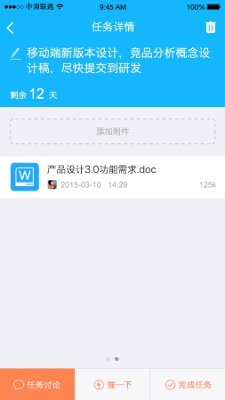 5.在工作场景,任务的完成,都是会有产出的。而承载这些产出的,往往是各种各样的文档。所以在imo班聊的任务功能中,会有“附件”的功能。
