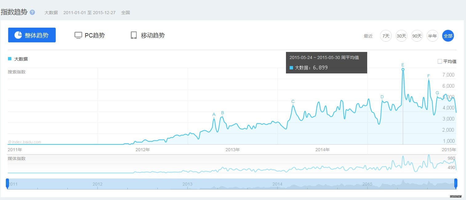 中国股市向来不缺乏紧追概念的意识,随着2015年5月26日2015贵阳国际大数据产业博览会召开,公众对大数据的关注度一下子达到了峰值,这可以从下图的百度搜索指数中反映出来。与此同时,在沪深二级市场,大数据概念股的投资也引起了高度关注,板块内个股的走势明显优于大盘。