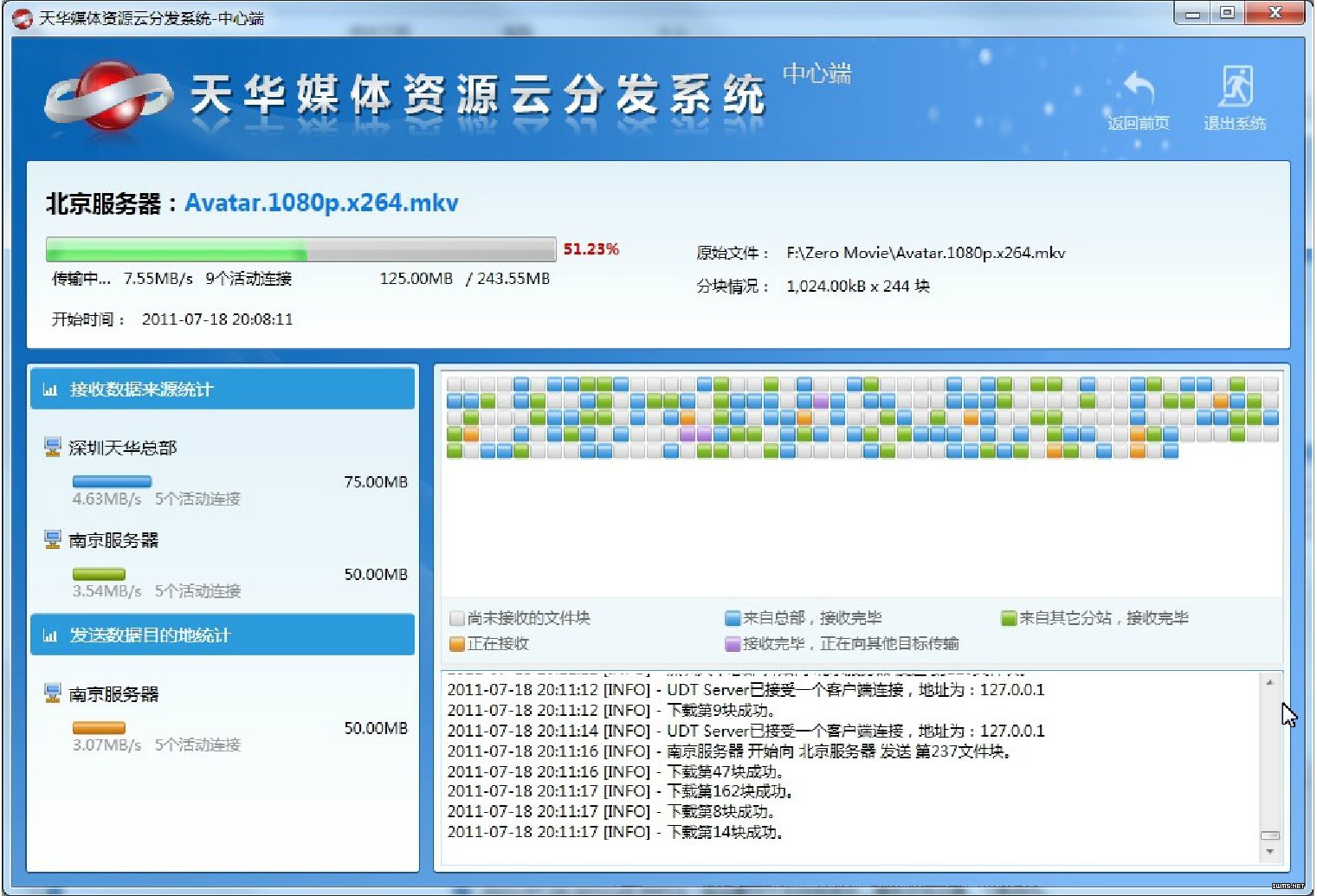 基于此,云创大数据针对地面大数据传输,自主研发了高速数据传输系统cTrans。cTrans所特有的流水线式高速数据传输技术,基于标准的UPD协议,将传输与存储作联合优化,并支持多点中继高效传输,在实时处理海量同时,实现数据的高速远程传输。多项实地远程传输试验表明,cTrans能够将互联网远程数据传输效率提高4-80倍,特别适合海量数据的远程传输。目前已经广泛应用于广电节目分发和卫星数据地面传输。