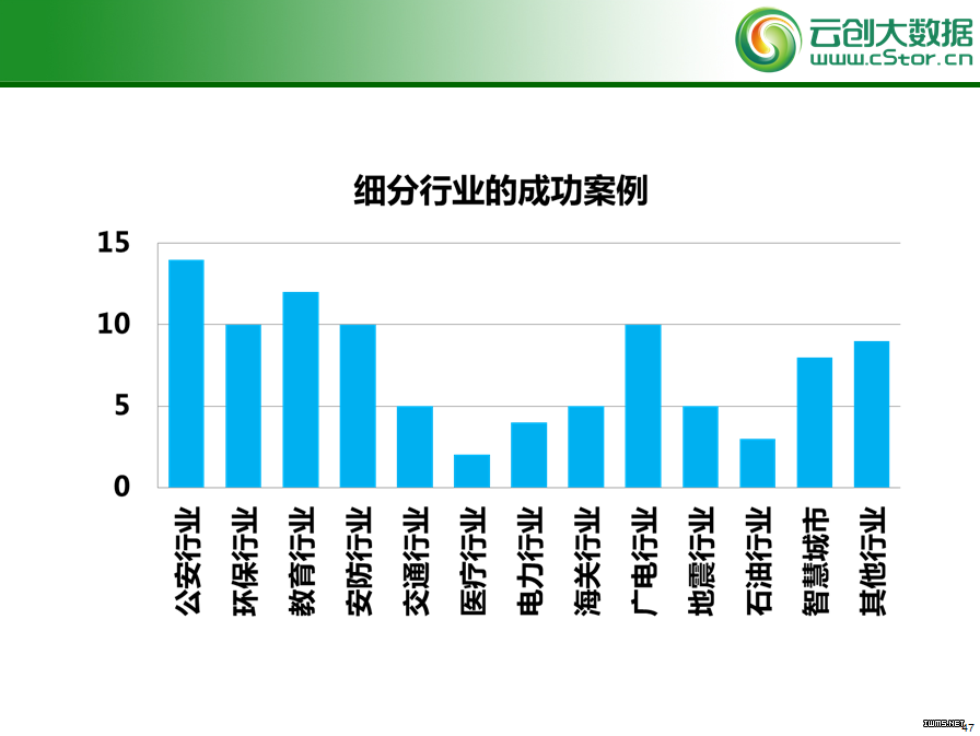 无论是存储、处理或是传输,关键还是要将大数据落到实处,使之得以具体应用。云创大数据推出了一系列行业解决方案,并已经拥有约100个成功案例。