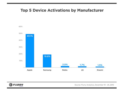 周一的时候,雅虎旗下分析公司Flurry展示了苹果设备在“圣诞送礼季”(12月19至25日)的激活数。根据其收集到的数据,iPhone和iPad占据了激活设备数的半壁江山(49.1%)。不过与iPhone 6和6 Plus刚推出的2014年相比,其表现还是疲弱了2.2个百分点。排名第二的是三星,其占比为19.8%,较2014年上升了2.1个百分点。该公司对平板手机非常倚重,其中有半数大屏智能机运行Google Android操作系统。