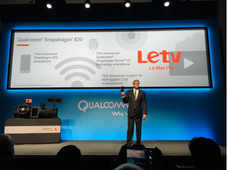 图:与“Le Future”发布会同一天的高通发布会上,高通CEO史蒂夫·莫伦科夫展示乐视超级手机
