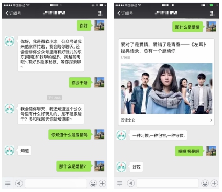 对公众号的订阅者与粉丝们来说,小冰可不仅仅是冷冰冰的微信人工智能助手,在通过有趣的交互对话提高微信公众号粉丝活跃度的同时,她还能索引公众号的文章内容,并及时呈现给有需求的用户。现在微信公众号一键绑定小冰,即可免费激活你的社交账号运营管理小助手。