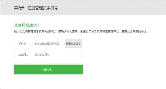 ③ 授权成功后,注册管理员手机号、获得动态口令后点击完成。在这里请注意,一个手机号对应一个公众号,这个号码可以不是你微信后台管理员与运营者的账号,但必须要是一个没有绑定过小冰后台的手机号。记住这个号码,这是之后登录小冰管理平台的凭证。