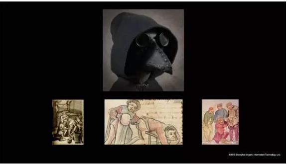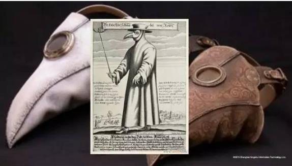 大家可能还不知道这玩意,大家都没见到过,这是当时中世纪医生的行头,我们现在是听诊器了。当时的医生必须要有这个,标准的行头就是这样,戴了宽檐的帽子、黑袍,戴了面具。当时看你很难想象,但是当时是很认真的。假如你受伤了以后,要么去教堂开的医院,教堂那个时候的医院基本上是没有医生的,是宗教安抚、安慰为主。你碰到脚断掉或者伤口流脓了,基本上到理发店去,那个就是诊所。但是你进去的时候,看到的医生是这样子的,那个时候,标准的医生的形象。这个面具是怎么用的?面具是防止病人的感染传给他,所以已经有抗感染的意识预防开了。这样给医生看了以后,如果你怕痛,他就把你捆起来,甚至直接一滚子把你打晕掉,那个时候是认真的。