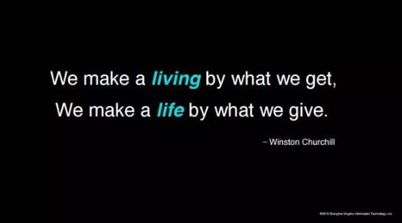 最后就是我想用丘吉尔的一句话,我们人类是通过摄取大自然的一些资源来使得我们维持我们的生命,我们叫living,但是我们的生活是通过我们不断的去分享,去创造价值而获得我们的生活,所以living跟life而一定是两个概念。到底你是希望你的生命延长得更长,还是希望获得一个美好的生活呢?这个是每个人心里都有一个选择。但是只要有一点,当我们认识到我们人类无法抗拒死亡的时候,你知道自己总有一天,我的生命会像蜡烛一样灭掉的时候,你就会对周围的人更加的宽容,你对自己所做事情就更加的执着。我想今天,实际上也是我生活的一部分,来跟大家分享我的生活哲学、创业哲学。