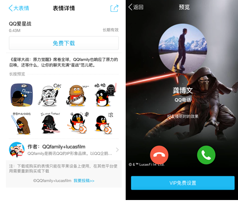 据悉,截止到目前,QQ和《星球大战:原力觉醒》相关合作的QQ表情已经上线,后续双方合作的气泡、挂件、皮肤以及联合推广的H5等内容,也会相继推出。