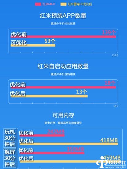 以红米Note为例:数据显示,一款全新的红米Note中有139项预装程序,其中大部分属于小米卡包、游戏中心等商业性较强但实用性较弱的APP.在利用雷电OS进行优化后,有53款预装软件可以被禁用,后台自启的应用也能够由18项减少为13项,极大地减轻了红米手机的运行负担。