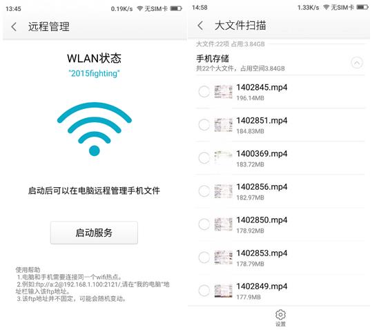 只要保证电脑和手机在同一个网络下,便可开启远程管理,避免连接电脑的麻烦。大文件清理功能主要是为追剧党设计,手机缓存一些电视剧之后,空间越来越小,手机变卡了,大文件管理功能可以帮你找到手机中占据内存比较多的文件,一键清理,解决手机的内存不足的困扰。这个功能,对于存储空间较小的用户尤其适用。