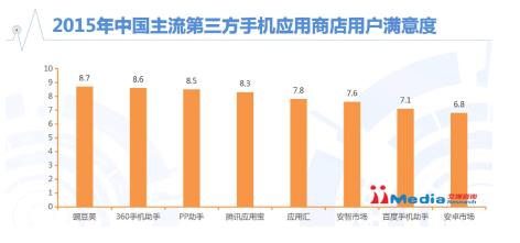 艾媒数据显示,2015中国主流第三方手机应用商店用户满意度上,豌豆荚以其简洁干净的特色也获得8.7的用户满意度排名第一,360手机助手以8.6紧随其后,PP助手排名第三,用户满意度8.5。前三名在应用的质量、内容、品牌力、设计、应用权限等方面更加优化和全面,得到更多用户青睐。