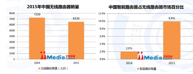 据艾媒咨询数据显示,2015年国内无线路由器市场为6520万,下滑超过10%,家用WiFi设备进入市场饱和期。而2015年智能路由器销量突破650万台,占比从前年不到的2%增长至9.9%。智能路由已经成为这个传统行业中一股不容小觑的力量。
