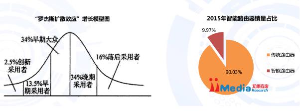 根据“罗杰斯扩散效应”,当一个产品的普及率超过 15%时,就会迎来第一波指数型增长。艾媒分析师认为,经过两年时间快速发展,智能路由器用户已达整体路由器用户的10%左右,处于15%的临界值左侧的快速爬升阶段,2016年有望实现突破性爆发式增长。