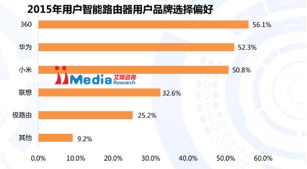 根据iiMedia Research(艾媒咨询)的《2015年度中国智能路由器市场监测报告》显示,在用户选择智能路由器品牌偏好上,360安全路由以56.1%的比例高居榜首,成为最受用户欢迎的智能路由器;其中华为以52.3%,小米以50.8%位列第二和第三名。