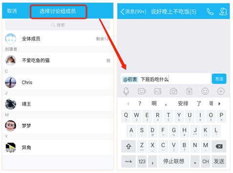讨论组成员只要在文字栏输入“@”,将会自动触发【选择成员】选项,点击对象,就可以实现将消息发送给对方,即使在消息杂乱的群里,也能实现精准处达。