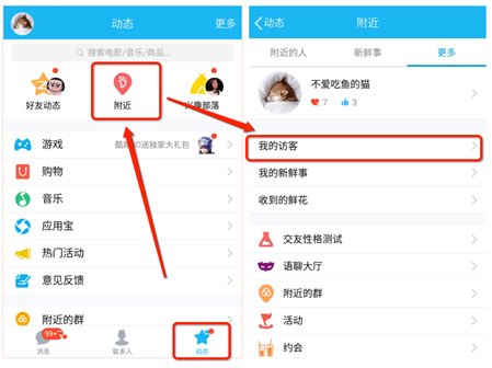 用户只需在手机QQ主页面中,选择【动态】-【附近】-【更多】-【我的访客】就可以看到访客名单。