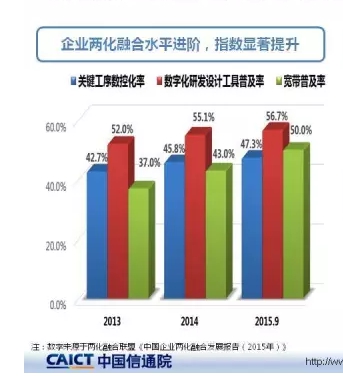 2015年推出的“中国制造2025”中规定3个指标考量两化融合的整体水平,包括数字化研发设计工具普及率、关键工序数控化率、宽带普及率。近三年来,这三个指标快速进步。