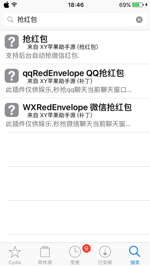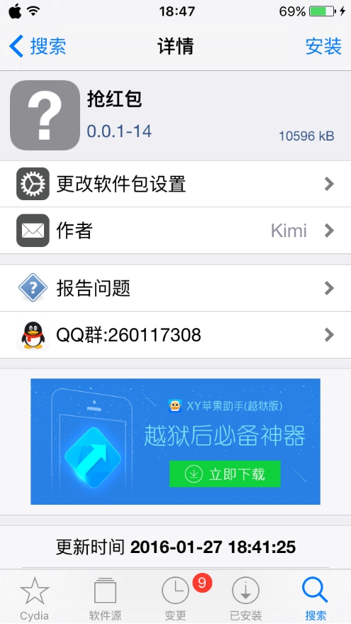 步骤一、首先同学们在Cydia里添加XY苹果助手源(apt.xyzs.com)搜索“抢红包”进行安装,同学们注意了,本插件只适用于iOS7及以上系统的越狱设备,没有升级的赶紧升级喽。