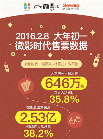 2月8日,电影春节档开盘第一天,以《美人鱼》、《西游记之孙悟空三打白骨精》、《澳门风云Ⅲ》三部影片为首的电影市场票房火爆,总额达到6.4亿,超过去年初一电影3.7亿的票房成绩。其中,微影时代双平台占比达到38.2%,贡献票房超2.5亿,相当于2014年初一大盘的票房总额。值得一提的是,在大年初一,双平台预售影票数达到300万张,占据微票儿和格瓦拉双平台当天观影人次的46.2%份额,超强的预售能力,在档期初期就给大盘打了一针强心剂,对大盘中后期的持续爆发助力非常显著。