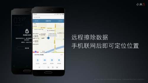此外,小米5此次新增了升级版防丢失功能,遗失手机后可进行远程锁定,从底层加锁保护数据,即使刷机后也能持续追踪,另外还可远程擦除数据。