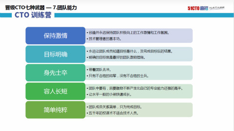 由51CTO高招主办的CTO训练营,在风起雨涌的互联网时代,邀请众多来自一线知名企业的技术大咖导师,陪技术人筑梦CTO,共同前往技术巅峰!一个月紧锣密鼓的准备,三位风格各具特色的特邀嘉宾,围绕技术管理者团队管理与技术决策力展开分享,近百位技术人现场互动,给这个平常的日子,增加了一抹火一样的色彩。