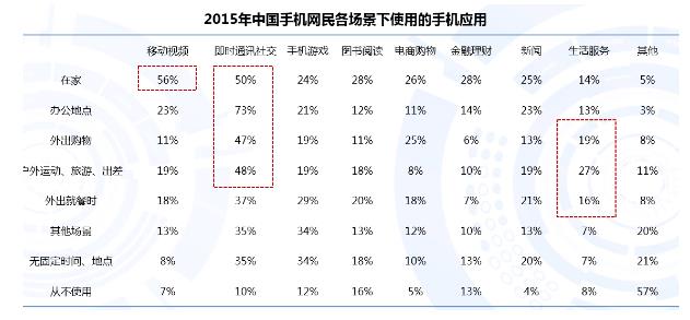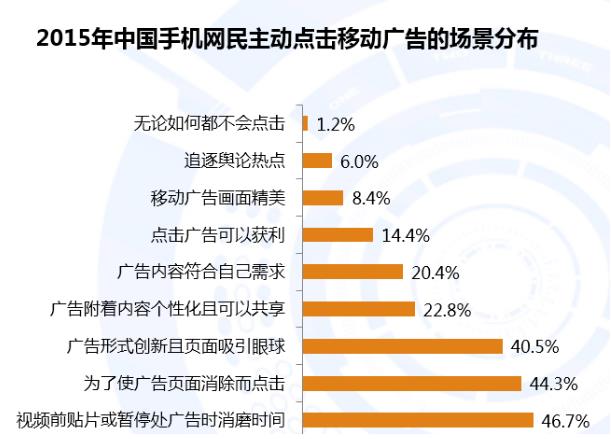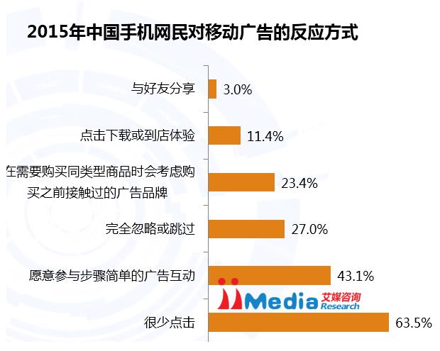 iiMedia Research(艾媒咨询)数据显示,在家观看移动视频的用户占中国手机网民总数的56%,即时通讯社交应用的使用场景分布较广,生活服务类应用在外出购物、户外运动、旅游、出差与外出就餐等场景下的使用频率较高8.四成用户愿参与广告互动,互动形式和内容是关键iiMedia Research(艾媒咨询)数据显示,63.5%的中国手机网民很少主动点击移动广告,但仍有43.1%的用户愿意参与步骤简单的广告互动。广告形式的互动性,广告内容的个性化和可分享功能是吸引手机网民主动点击移动广告的主要因素。