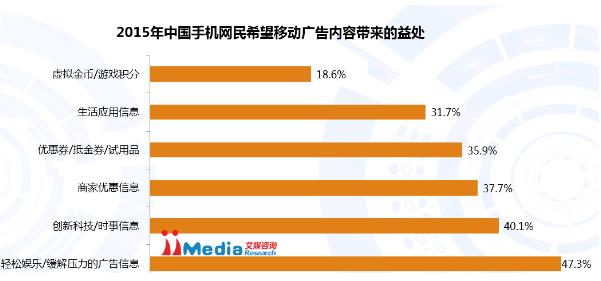 iiMedia Research(艾媒咨询)数据显示,互动分享(39.1%)、定向推送(35.3%)和短视频广告(29.3%)是中国手机网民较为感兴趣的移动广告形式。
