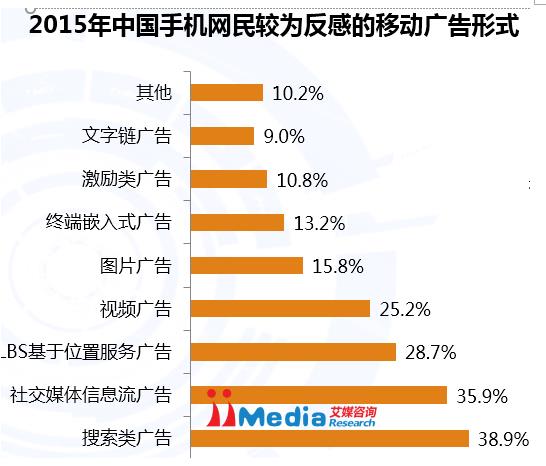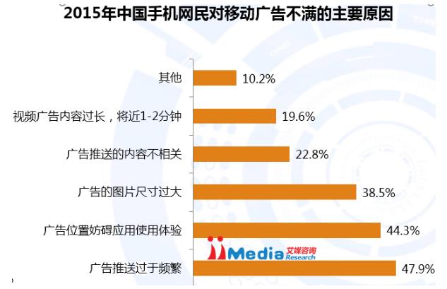 10.搜索广告最反感;推送频率过高最易引起反感iiMedia Research(艾媒咨询)数据显示,搜索类广告(38.9%)是中国手机网民最为反感的移动广告形式,其次为社交媒体信息流广告(35.9%)。广告推送频率过高和妨碍应用使用是造成手机网民不满的主要原因,分别有47.9%和44.3%。