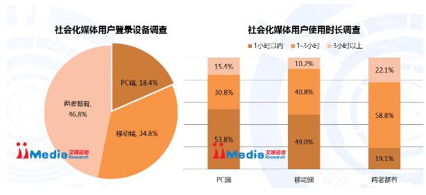 iiMedia Research(艾媒咨询)数据显示,只有18.4%的社会化媒体用户仅使用PC端登录帐号,接近半数社会化媒体用户同时使用PC端登录帐号。跨屏用户的平均使用时长要高于仅在PC端或仅在移动端登录的用户。