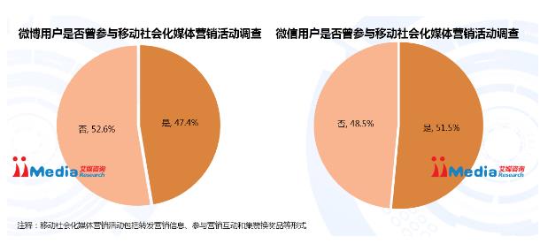 26.移动社会化媒体用户:尚有半数未参与营销iiMedia Research(艾媒咨询)数据显示,2015年只有大约5成的用户参与过移动社会化媒体营销活动。其中,有51.5%微信用户参与过移动社会化媒体营销活动,微博用户参与营销活动比例稍低一些,占到47.4%。
