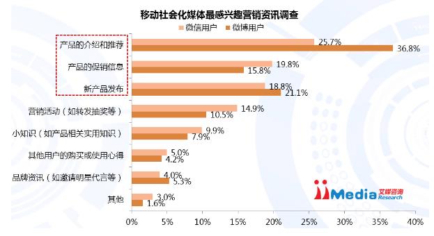 29.微博用户注重产品资讯获取,而微信用户更乐于参与互动iiMedia Research(艾媒咨询)数据显示,产品的介绍和推荐、产品的促销信息和新产品的发布这三类产品相关信息受到移动社会化媒体用户的关注。其中,微博用户更注重产品资讯的获取,而微信用户更乐于参与互动。