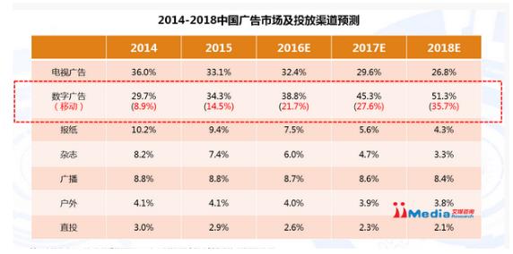 iiMedia Research(艾媒咨询)数据显示,移动广告市场中短、彩信广告占比逐年下降,预测到2018年仅剩1.5%,短、彩信广告将逐渐退出舞台。另一方面,移动搜索广告和APP广告发展迅猛,艾媒咨询分析师预测,到2018年,移动广告市场将主要由APP广告(40.9%)和移动搜索广告(37.6%)构成。