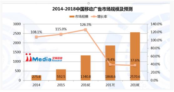 iiMedia Research(艾媒咨询)数据显示,从2014年起,移动广告市场增速均保持在100%以上,2015年市场规模达592.5亿元。预计2018年中国移动广告市场规模将超过2500亿元。