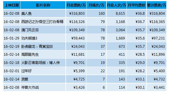 2016年2月,电影行业票房68.7亿,同比2015年2月的41亿增长了67%;春节档期7天再创36.5亿的档期票房新高;月度影片票房前三名分别是:《美人鱼》31.7亿、《西游记之孙悟空三打白骨精》11.6亿、《澳门风云Ⅲ》10.9亿。