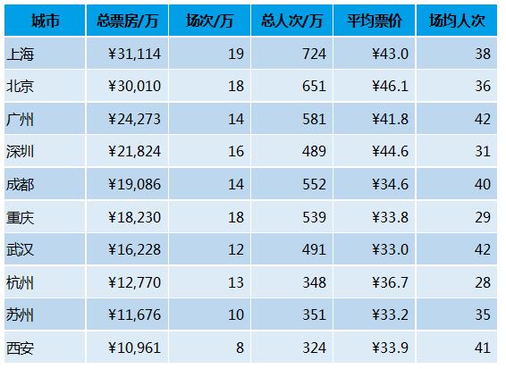 2月Top10城市票房占整体票房的28.5%,其中,上海、北京、广州、深圳分别以3.1亿、3.0亿、2.4亿、2.2亿位列前四,并且,这四个城市的平均票价均大于40元/人。