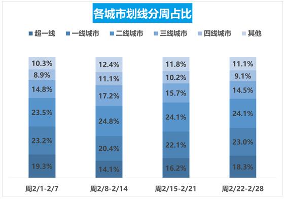 城市划线占比:春节假期期间,票房向三四线城市下沉明显