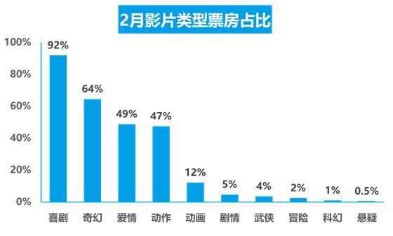 影片类型:2月份影片类型以喜剧、奇幻、爱情、动作为主,其中喜剧片占比高达92%
