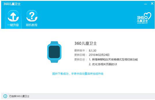 将PC端软件安装成功后,通过手表的充电线连接电脑,插入后,360儿童卫士固件升级软件非常智能,迅速识别手表型号,并自动检查有无最新固件,若有最新固件,提醒主人进行升级,一键升级,非常智能,我们只需等待手表固件升级成功。