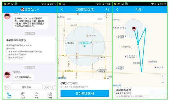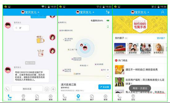 手机APP软件支持与家长进行互动,同时还能将骚扰孩子的手机号进行拦截,并推送到父母(管理员)的手机上,让父母随时关注到孩子的动态。手表的定位功能采用GPS芯片、集成WiFi、基站、重力传感四重定位技术,定位精度达到室内20米、室外5米,保证迅速准确定位孩子的位置,帮助家长随时掌握孩子行踪,关注孩子动向。圈子作为一个社交的小型社区,将孩妈、孩爸集中在一块,分享自己的感受、技巧、方法,同时还能获取到有用的社交信息,帮助家长更好的管护自己的孩子。