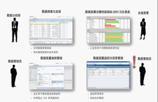 如图所示,该软件有助于检测数据质量错误,让业务用户能够定义数据质量规则,并通过预建的仪表盘和质量指标监控进程与异常情况