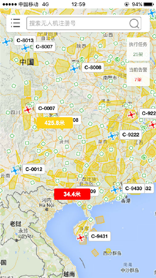 这个苹果手机下载的掌上优云页面,可以直观地看到全国的限飞区和通航机场等信息,以及注册的无人机飞行实时状况(飞机型号、飞行高度、速度、轨迹图等)。该系统会结合禁飞区数据和电子围栏,对无人机飞行过程实时监视,自动告警。