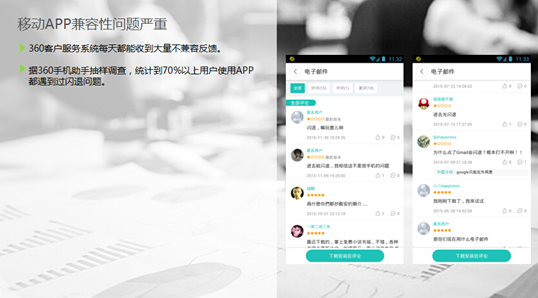 与手机App应用环境的不安全性伴生的还有手机App的兼容性问题,技术专家认为,不安全性与兼容性问题在根源上是同一类问题,大多是由盗版、山寨App泛滥而导致。360客户服务系统每天都能收到大量不兼容反馈,据360手机助手抽样调查,统计到70%以上用户使用应用都遇到过App闪退等不兼容问题。