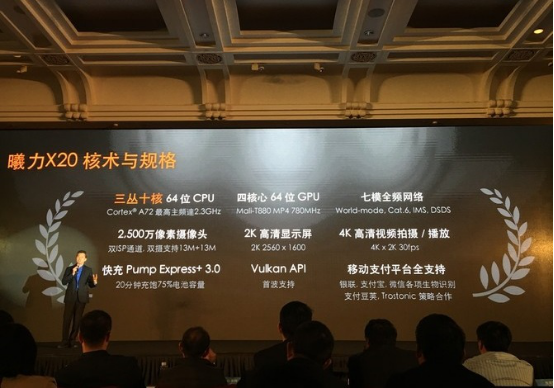 在本次发布会,联发科发布了曦力X20处理器。据介绍,曦力X20采用三丛集架构。通过CorePilot 3.0技术,在三个丛集间对十个核心进行自由调度和搭配,功耗相比传统双丛集架构处理器降低30%,运算能力提升15%。曦力X20处理器再一次彰显了联发科进军高端芯片市场的决心。